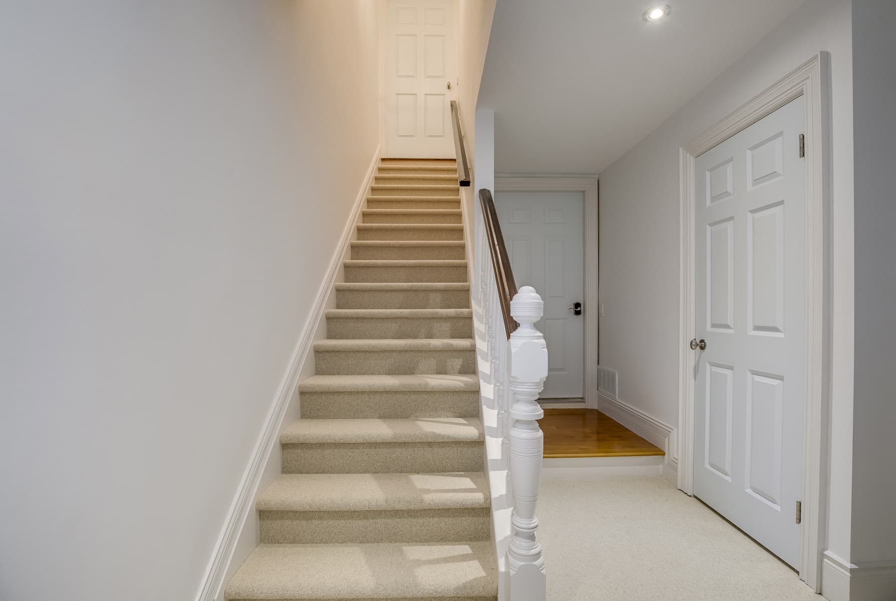 Modern farmhouse foyer features a custom staircase with wrought iron stair.